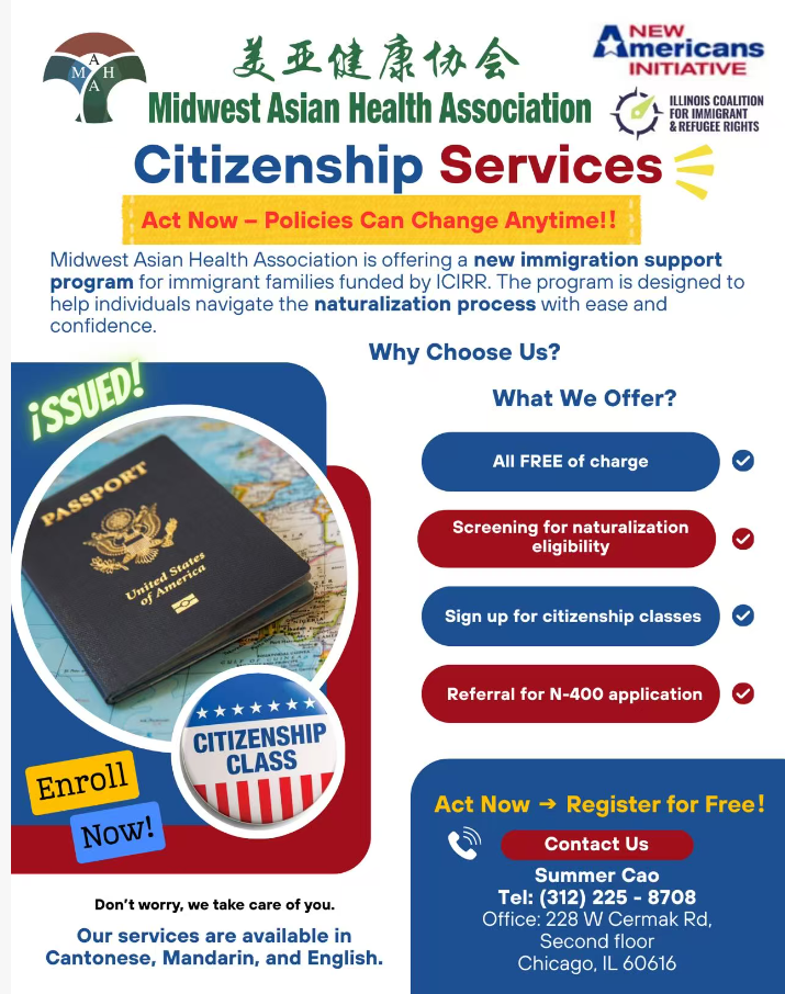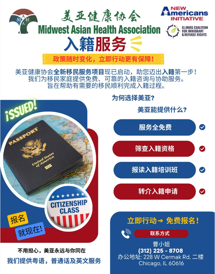 【神州时报讯】美亚健康协会启动美国公民入籍项目: 为了确保您和家人在通往入籍的过程中更加顺利,少走弯路,美亚健康协会同仁帮您和家人排忧解难,一路陪伴,协助您顺利到达获得美国公民的目标! 我们推出了以下免费的入籍服务:
