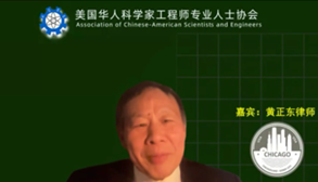 随后,主持人赵湘女士介绍了自己及嘉宾们。赵湘女士提到嘉宾黄正东律师是美国芝加哥清水正东律师事务所律师,美国诉讼律师荣誉院院士(fellow)。 获美国耶鲁大学法学硕士学位(LL.M)及法学博士学位(J.S.D.)。被列入美国Martindale-Hubbell律师名录。他曾在Keck, Mahin & Cate和Piper,Rudnick & Wolfe美国两大律师事务所从事律师工作, 并曾任美国芝加哥德保大学法学院的兼职教授, 武汉大学和上海同济大学兼职教授, 香港大学法学院的研究生校外督导员。黄正东律师连续9年被评选为伊利诺伊州超级律师(2017至2026)。曾被评选为美国卓越律师(Premier Lawyers of America, 只有1%的美国律师获选), 并获美国国会议员全球奖最佳律师奖。黄正东律师曾出版书籍及在中国和美国的法律刊物上发表法律论文、文章若干篇。他热心为华人社区服务,现在担任大芝加哥地区华侨华人联合会主席。