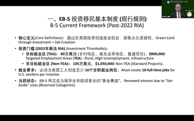 汤学武律师则重点介绍了 EB-5 投资移民政策的发展与现行制度。他回顾了 EB-5 自 90 年代设立以来的演变过程,并解读了 2022年3月份改革后对乡村项目、高失业地区项目及基建项目的优先处理安排。目前 32% 的优先配额中,20%分配给乡村项目,10%分配给高失业地区项目,2%分配给了基础建设项目;其中乡村项目的优先审理,在所有的投资移民项目中速度最快,通常为 12–18 个月。汤律师同时强调了 EB-5 项目的合规要点,包括资金来源合法性、就业创造标准以及项目真实性,提醒申请人警惕“伪乡村项目”风险。汤学武律师还特别提醒,EB-5 申请人若希望享受 同时递交(Concurrent Filing) 的政策便利,需在美国境内递交申请,并注意 2026 年 9 月 30 日前提交申请 以获得“祖父条款(grandfathering)”保护。