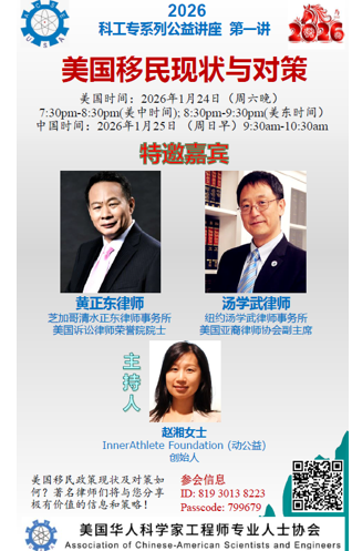 【神州时报讯】美国移民政策现状及对策如何?美国时间2026年1月24日晚, “美国华人科学家工程师专业人士协会” (简称:科工专, The Association of Chinese-American Scientists and Engineers, ACSE)成功主办了举办了公益讲座- “美国移民现状与对策”。当晚的主持人是赵湘女士。嘉宾是(按alphabetical order)黄正东律师,汤学武律师。