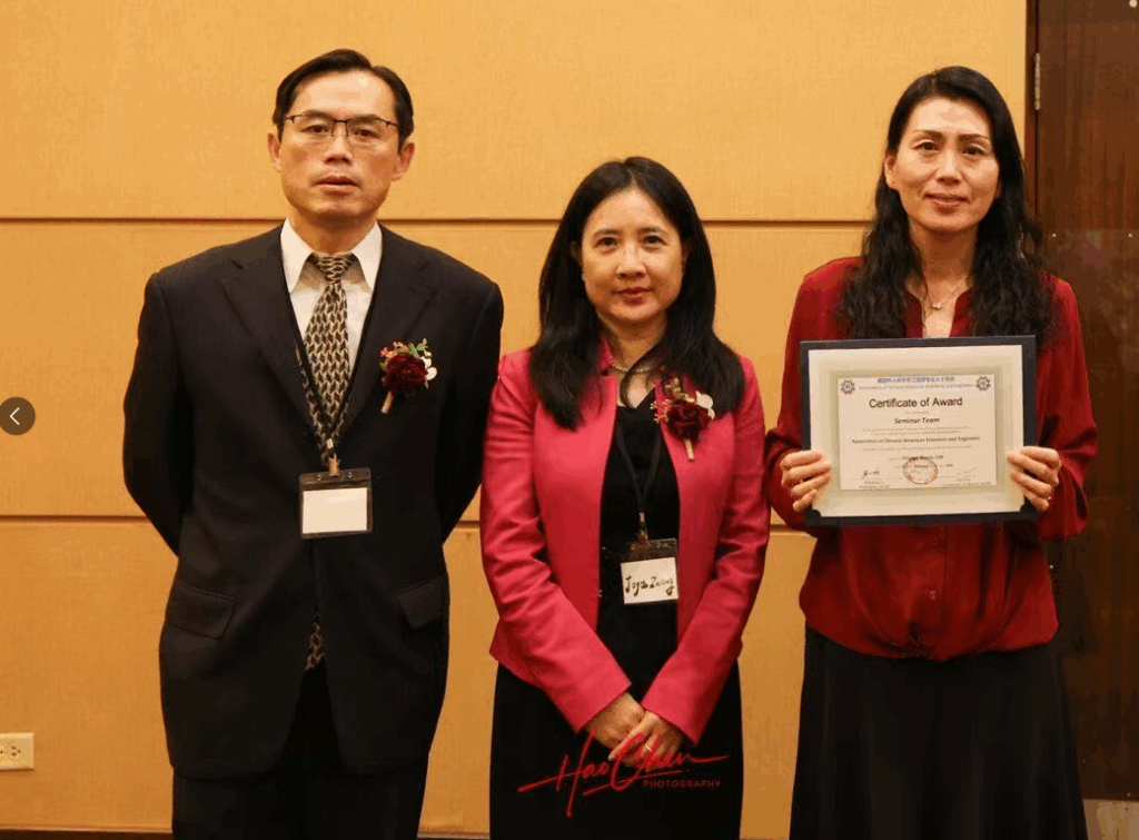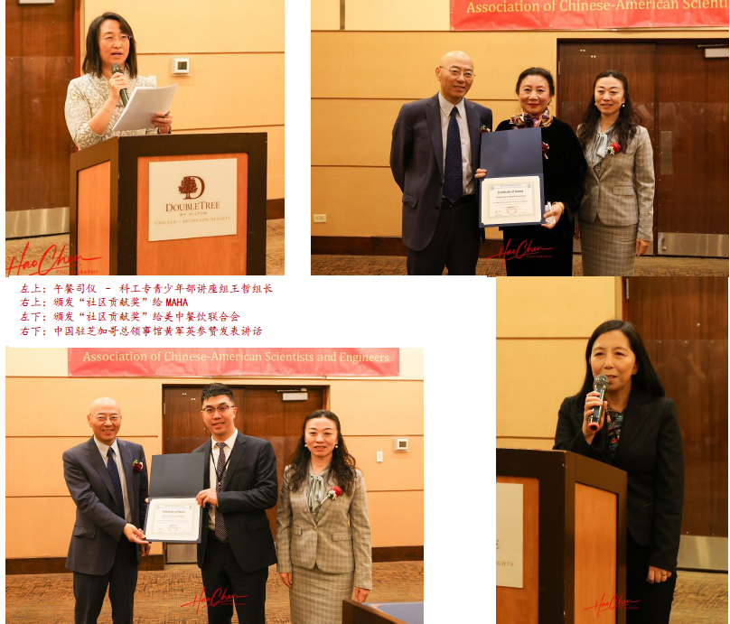 在中午的交流午宴中,宾主们在友好而热烈的氛围中共聚一堂。午宴由科工专青少年部讲座组组长王哲女士担任司仪。她首先请科工专会长和理事长本次活动的赞助机构颁发了“社区贡献奖”,获奖单位为 MAHA 与美中餐饮联合会。两家机构的代表——刘晔女士与王欢副会长——先后上台致辞,表示愿意长期支持像科工专这样对社区发展具有积极影响的专业组织,并希望未来能够与科工专携手,共同推动华人社区的繁荣与进步。中国驻芝加哥总领事馆黄军英参赞也在席间对科工专第33届年会的成功举办表示热烈祝贺,并充分肯定了科工专多年来在推动科技交流、促进中美友好合作及服务华人专业群体方面所作出的重要贡献。