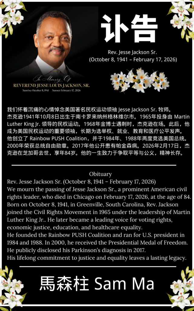 【神州时报讯】美国著名民权运动领袖、社会活动家 Jesse Jackson Sr.牧师于2月17日在芝加哥去世,享年84岁。消息传出后,美国社会各界纷纷表示哀悼。