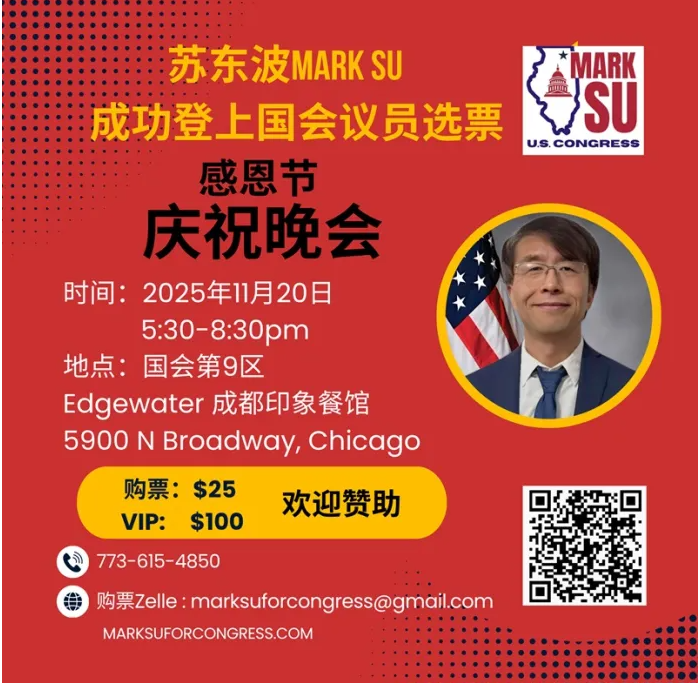 Mark Su是这次选举中唯一的一个华裔候选人,也是芝加哥乃至伊利诺州历史上第一个国会议员候选人,开创了华人登上国会议员选票的历史,为了庆祝目前的进展,苏马克国会议员选举委员会将于这周四,11月20日在位于国会第9区的北华埠附近的成都餐馆举行庆祝会,邀请各界嘉宾共庆感恩节。