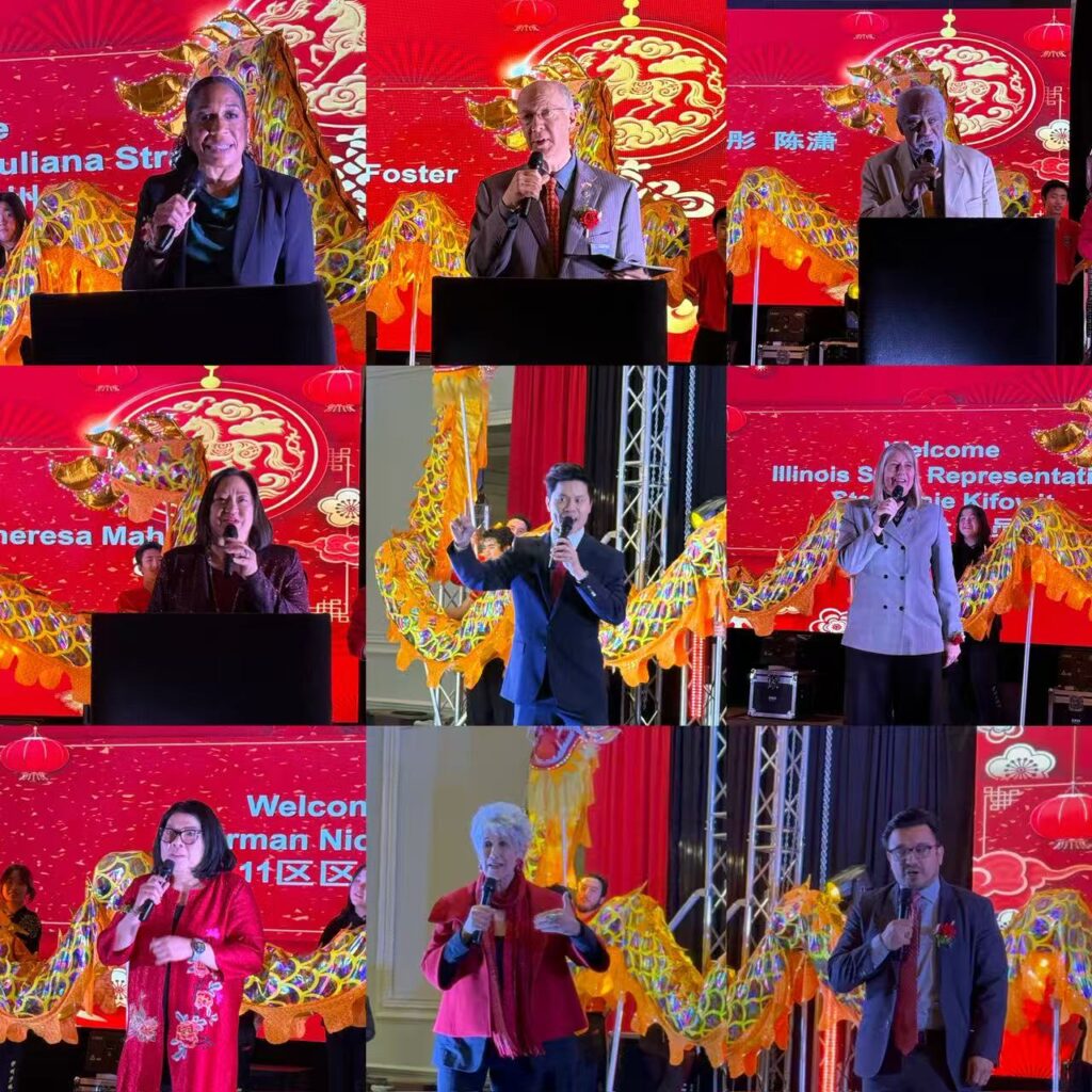 伊利诺州副州长Juliana Stratton 表示,华人社区是伊州不可或缺的重要组成部分。国会议员丹尼戴维斯、Bill Foster分别致辞,祝愿马年事业腾飞。出席并致辞或到场祝贺的嘉宾还包括伊州众议员Theresa Mah、Stephanie Kifowit、La Shawn Ford,芝加哥副市长Beatriz Ponce de León,库克郡郡长Toni Preckwinkle,第11区区长Nicole Lee,第25区区长Byron Sigcho Lopez,库克郡财务长Maria Pappas 、伊利诺伊州众议员(第13区) Hoan Huynh等政要。多位嘉宾一致表示,将持续支持华人社区发展,推动多元文化交流。