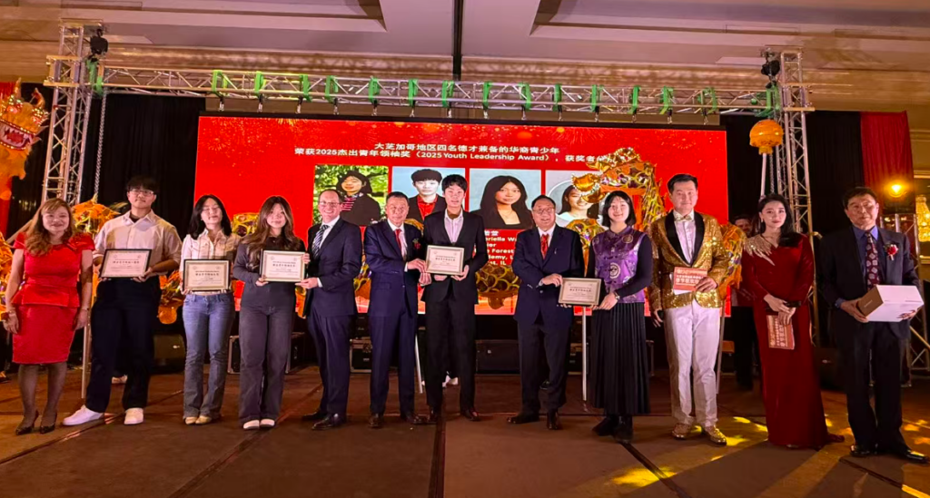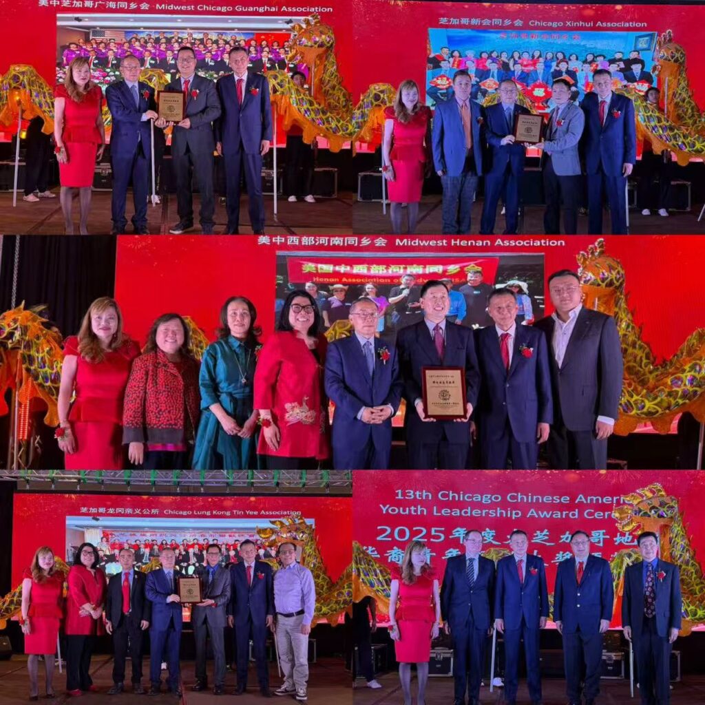 晚会颁发“2026大芝加哥地区杰出社区贡献奖”,表彰芝加哥新会同乡会、美中芝加哥广海同乡会、美国中西部河南同乡会及芝加哥龙冈亲义公所等团体长期服务社区的贡献。