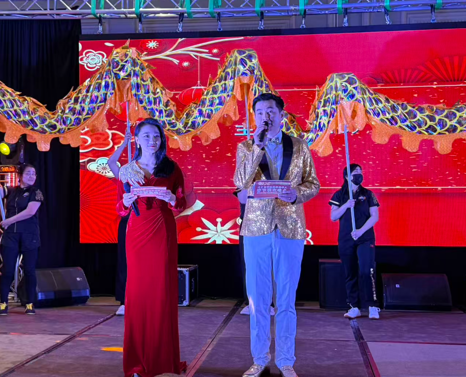 下午5时,晚会在轻松温馨的社交交流环节中拉开序幕。来宾们在茶点与音乐中畅叙乡情、结识新友,为正式仪式营造出热烈氛围。主持人朱彤表示:“在歌声中追忆故乡,在舞姿中迎接马年。”陈潇则以英文欢迎各界嘉宾,共同见证属于华人社区的荣耀时刻。