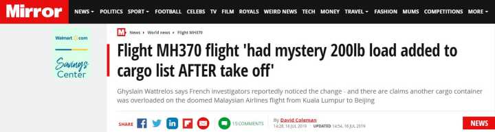 日前,法国工程师吉斯兰·瓦特勒洛在接受法国《巴黎人报》采访时表示,法国调查人员发现,MH370客机起飞前有乘客携带了重达89公斤的不明物品登机。瓦特勒洛说,“起飞后,89公斤重的不明物品才被添加进到航班的(货物)清单之中”。