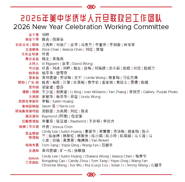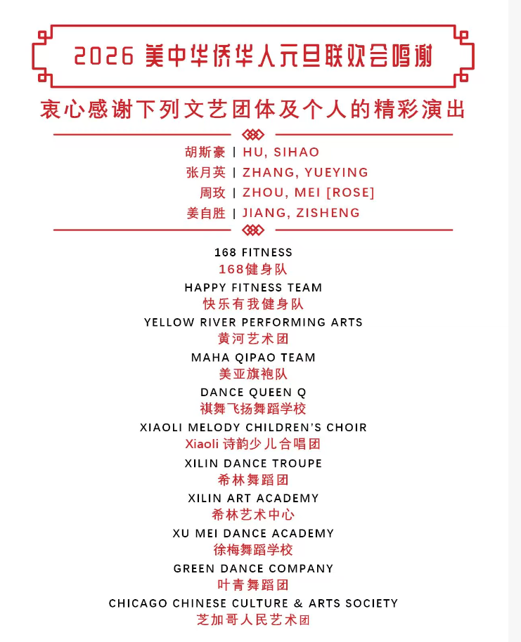 【神州时报讯】美中华侨华人元旦联欢会于2026年1月3日在芝加哥圆满落下帷幕,并取得了空前的成功。本次千人规模的盛大联欢会,充分展现了海外华人华侨对中华文化的深厚情感与积极传承精神。大会筹备委员会谨向所有为本次活动倾注心血与汗水的单位与个人,致以最诚挚、最衷心的感谢!