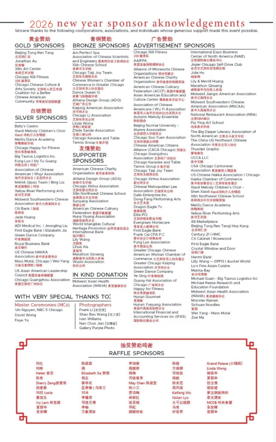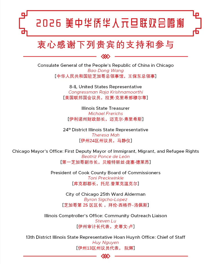 在此,特别感谢多位主流社会政要、中国驻芝加哥总领馆对本次活动的关心、支持与参与。同时,衷心感谢主流电视媒体 NBC、ABC、WGN以及各大华文媒体对联欢会给予的热情、及时且客观的报道。正是你们广泛而深入的传播,让更多社会各界人士了解并感受到华人社区的团结、活力与文化风采。