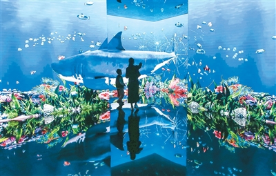 游客在山东省美术馆参观体验“无限之海”沉浸式AI数字艺术展。